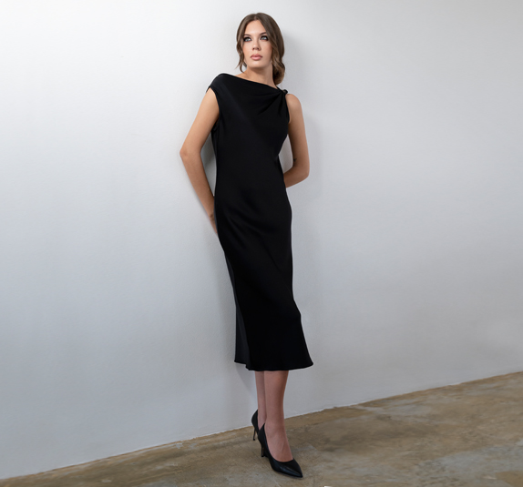 Il mio elegante e sofisticato abito nero longuette, in morbido e avvolgente crêpe cady, si allinea al trend del minimalismo, dalle linee pulite, essenziali e sartoriali, impreziosito da un piccolo drappeggio sul davanti che termina sulla spalla sinistra. Il valore aggiunto del capo è rappresentato dalle rifiniture tutte realizzate a mano. Ci ricorda l’importanza di capi semplici e ben tagliati, indispensabili nell’armadio di ogni donna.