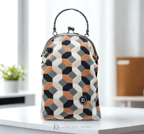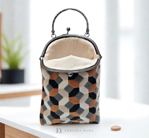 Le borse piccole da portare a mano conquistano gli outfit di stagione. Le tradizionali pochette lasciano il posto ad accessori pratici e glamour, perfetti da sfoggiare in ogni occasione: i modelli più versatili e raffinati che si adattano a look e occasioni diverse, senza mai perdere di stile. Questa borsetta in velluto con manico in metallo, nonostante il suo minimalismo si fa notare anche per la chiusura clic clac o kisslock. Borsetta dal gusto vintage, di piccole dimensioni, pratica, raffinata e molto elegante, con manico in metallo brunito, tessuto a disegno geometrico è da portare a mano. La storia della borsa con chiusura clic-clac è legata ai portamonete di un tempo, in particolare ai modelli in metallo che si aprivano e chiudevano con meccanismo a scatto su cui, esercitando una piccola pressione, faceva emettere il caratteristico suono. Compatta e semplice, è perfetta per molte occasioni, in particolare quelle formali o in serate speciali. Confezionata e rifinita a mano con materiali di prima qualità.