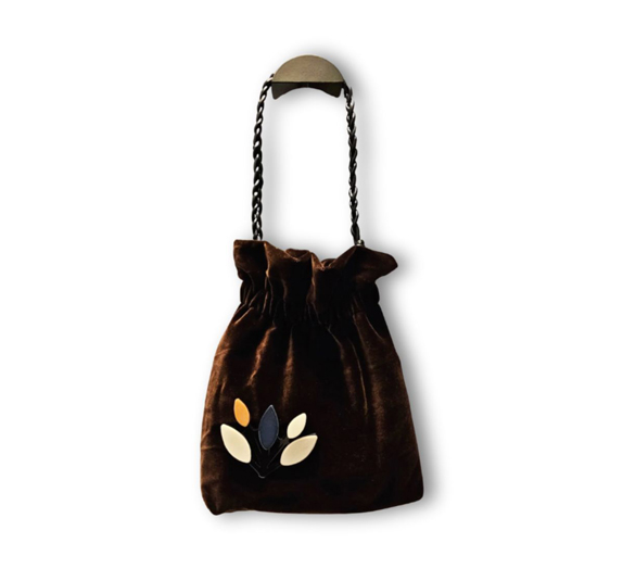 The velvet handbag with a braided crossbody strap, soft and pleasant to the touch, is very trendy for the upcoming fall. An undisputed star of streetstyle, it’s an elegant and versatile fashion accessory also suitable for everyday use; it lends itself to various pairings: from an elegant look to a more casual one. This brown handbag, with slight gathering at the top, has a braided leather strap and a snap button closure, embellished with a removable floral-themed brooch. Handmade and hand-finished with top-quality materials. Compact, simple, and refined, suitable for any occasion.